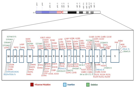 The CBS gene is located on the long arm of chromosome 21 with 191 variants having been described [40] (Figure 2). The most frequent pathogenic and reported mutations in different countries around the world are p.G307S (31%), and p.I278T (24%) [41,42]. The p.G307S mutation is the most prevalent CBS deficiency mutation in Ireland and Australia [6,23]. It is located on exon 8 of CBS gene, where guanine at position 919 is replaced by adenine nucleotide (c.919G>A). This change leads to glycine to serine substitution at position 307. Homozygous patients are severely affected with minimal to nonresponse to pyridoxine (B6) treatment [28,43]. Studies showed that p.G307S mutation is also frequently detected in homocystinuria patients of Celtic descent [43]. Using molecular dynamic simulations, a study showed that p.G307S mutation impaired the catalytic function of the CBS enzyme by preventing the tyrosine residue at position 308 to assume the proper conformational folding. This state is required for forming the pyridoxal–cystathionine intermediate. Additionally, results showed CBS with p.G307S mutation is stable, but inactive, and hence does not respond either to chaperone-based therapy nor pyridoxine treatment [24].