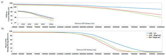 We then measured the phasing accuracy and yield across pairs of SNPs (Figure 2) following the method reported by Snyder et al. [3]. Figure 2a shows pairwise SNP phasing accuracy of the three methods tested. The results showed that the phasing accuracy stayed above 98% (2 errors out of 100 heterozygous SNPs) for distances up to 72 Kb for HiC-Hapcut2, 93 Kb for 10X–HapCut2, and 100 Kb for 10X-LG. The phasing accuracy for 10X-LG stayed over 92% for distance up to 4 Mb. Figure 2b shows a phasing yield representing the probability that a pair of SNPs is phased in the same phasing block as a function of distance between the pair. Considering a distance up to 550 Kb, the phasing yield of 10X–HapCut2 and HiC-Hapcut2 remained over 90% and, for 10X-LG phasing, yielded over 90% extended up to 780 Kb.