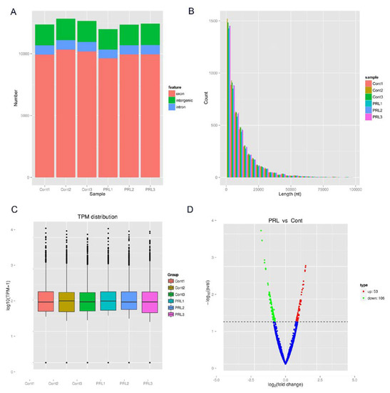 High expression of circRNAs in dairy cow mammary epithelial cell lines (MAC-T cells) after prolactin (PRL) treatment. (A) Genomic regional distribution of circRNAs in control and PRL-treated MAC-T cells; (B) Length distribution of circRNAs in control and PRL-treated MAC-T cells; (C) The box plot of the global expression of circRNAs in control and PRL-treated MAC-T cells; (D) Volcano plot constructed using fold-change values and p-values. The vertical lines correspond to 2.0-fold up- and down-regulation between control and PRL-treated MAC-T cells (control vs PRL), and the horizontal line represents a P-value. The red and green points in the plot represent the differentially expressed circRNAs with statistical significance. TPM reads transcripts per million.