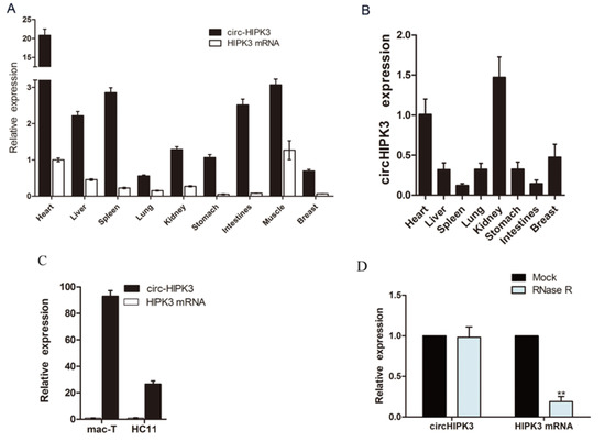 The circHIPK3 is widely expressed. (A) The expression profile of circHIPK3 and HIPK3 mRNA in cattle tissues; (B) The expression profile of circHIPK3 and HIPK3 mRNA in mouse tissues; the mean ± SEM of tissues from six cow or mouse samples; (C) The expression profile of circHIPK3 and HIPK3 mRNA in MAC-T cells and mouse mammary epithelial cell lines (HC11 cells). The mean ± SEM of three samples and three independent experiments; (D) The expression of circHIPK3 and HIPK3 mRNA after treatment with RNase R. Mean ± SEM of three samples from three independent experiments. * p < 0.05; ** p < 0.01.