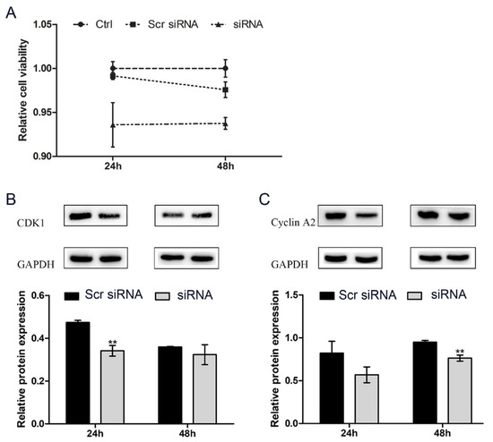 To assess the effect of circHIPK3 on proliferation, we knocked down circHIPK3 in HC11 cells by transfection with specific siRNA against circHIPK3 and then used the CCK-8 and Western blotting assays to analyze the effect of circHIPK3 knockdown on the proliferation of HC11 cells. Because general liposomes can hardly be transferred into MAC-T cells, we only explored the effect of circHIPK3 on HC11 cells. The CCK-8 assay show that the reduced expression of circHIPK3 markedly suppressed the proliferation of HC11 cells (Figure 3A). CDK1 [20] and Cyclin A2 [21] can be used as proliferation marker genes of the mammalian cell cycle. Western blotting showed that circHIPK3 knockdown reduced the protein expression levels of both CDK1 and Cyclin A2 (Figure 3B,C). Overall, these results suggest that circHIPK3 promotes the proliferation of HC11 cells.