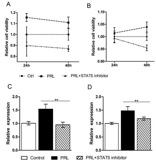 - Olazabal, I.; Munoz, J.; Ogueta, S.; Obregon, E.; Garcia-Ruiz, J.P. Prolactin (PRL)-PRL receptor system increases cell proliferation involving JNK (c-Jun amino terminal kinase) and AP-1 activation: Inhibition by glucocorticoids. Mol. Endocrinol 2000, 14, 564–575. [Google Scholar] [CrossRef]