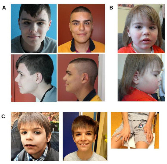 Patient 1 is a 16-year-old male born at 40 weeks of gestation from non-consanguineous Italian parents. The patient’s mother was 25 and the father was 30 years of age. He was born at term via eutocic delivery after an uncomplicated pregnancy. His birth weight was 3.750 kg (50–75th centile and his length was 51 cm (75–90th centile). His physical growth was regular, but he manifested with psychomotor delay and major language impairment. The child sat independently at seven months and walked at 16 months of age; he started babbling after 12 months of age and said his first words after 24 months. He reached sphincter control at about three years. At the last examination, at age 14, his cognitive and behavioral profile showed moderate ID with a persisting severe expressive language impairment. His intellectual quotient (IQ) as assessed using the WISC–IV scale was 40. He presented a severe speech disorder characterized by stuttering, speech dysfluency, articulation difficulties, and use of a poor and simple vocabulary. His neuropsychological profile highlighted communication and executive function difficulties, short attention span, and behavioral problems including verbal inhibitory control problems. Nonetheless, he was relatively collaborative. No sleeping problems were reported, and an autism diagnosis has not been made. No feeding and gastrointestinal problems were ever observed. He showed a mild pectus carinatum and moderate craniofacial dimorphisms; protruding supraorbital ridges, bushy eyebrows, deep-set eyes, bulbous nasal tip, short philtrum, and wide mouth (Figure 1A). Neurological examination was normal, except for a mild global dyspraxia and fine motor skills impairment. He never manifested seizures; EEG and brain magnetic resonance imaging (MRI)MRI were normal. His initial diagnostic examinations included a complete metabolic workup, conventional karyotyping, and Comparative genomic hybridization (CGH) CGH array (40 kb resolution) as well as Fragile X testing, which were all negative.