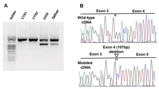 The c.1661_1664del and the c.374C > A variants are both predicted to result in a prematurely truncated protein of residues 554 and 125, respectively, while the c.381 + 2T > C variant in intron four is predicted to have deleterious effects on the donor splice site. To analyze the effect of this latter variant on mRNA splicing, reverse transcriptase-PCR was conducted on RNA extracted from blood leukocytes of the patient and his father. Agarose electrophoresis showed in both samples the presence of a shorter transcript product, with lower intensity in the father sample, compared to the wild type (Figure 3). The Sanger sequencing of this product revealed that the variant causes the skipping of the entire exon 4, resulting in a shorter aberrant transcript predicted to produce a prematurely truncated protein of 93 residues (Figure 3).