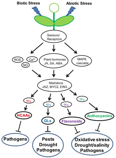 Plants are usually exposed to multiple stresses simultaneously or continually. Cross resistance is widely observed in plants and has been utilized in crop cultivation. In response to these diverse biotic/abiotic stresses, plants perceive these adverse cues through different sensors/receptors, which undergo structure transformation/modification upon acceptance of exogenous ligands, and then transfer signals to downstream processes. Many biological molecules and processes are induced/initiated such as plant hormones, ROS, Ca2+, and MAPK cascade. Signals are further transduced by a number of mediators such as JAZ, MYC2, EIN3 to the downstream TFs. These TFs directly bind to the cis-elements on the gene promoters to regulate gene expression and subsequent biosynthesis of secondary metabolites. Some secondary metabolites may directly inhibit pathogen infection or pest infestation. Others might participate into ROS scavenging to keep redox balance and confer drought/salinity tolerance to plants. Signaling crosstalk is observed in the whole pathway of signal transduction. Different stress factors might converge to activate the same signaling pathway and induce biosynthesis of the same secondary metabolites. Some secondary metabolites are also involved in resistance/tolerance against different stresses (Figure 3). For example, GLs usually exhibit toxicity to pathogens and insect herbivores. It was also reported to regulate stomatal movement and be involved in drought resistance []. Additionally, maize terpenoid phytoalexins, kauralexins defend fungal pathogens and exhibit antifeedant activity against corn borer []. However, the kauralexin-deficient an2 mutant is susceptible to drought stress in comparison to the wild type W22 plant, implicating involvement of kauralexins in abiotic stress responses []. Hence, more investigation should be conducted to explore the complicated regulation of secondary metabolism involved in stress response.