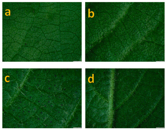 Microscopic images of leaf trichomes. A = no hairs, b = medium hairs, c and d = profuse hairy. Scale bars in (a–d) = 200 µm.