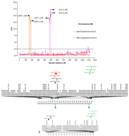 Physical representation of QTLs on chromosome A06 for leaf and stem pubescence. Vertical lines on the upper side of the figure indicating LOD values for leaf and stem pubescence against their genetic distances in centimorgan. Arrow signs show the location of QTLs for the respected trait. The lower portion indicates physical representation of QTLs on Chromosome A06.