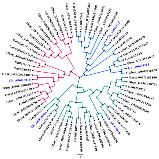 Phylogenetic relationship between candidate genes of G. hirsutum with G. raimondii, G. arboreum, and G. barbadense. The color scheme of the phylogenetic tree represents different clades. Gene IDs in the blue color are putative genes found in this study.