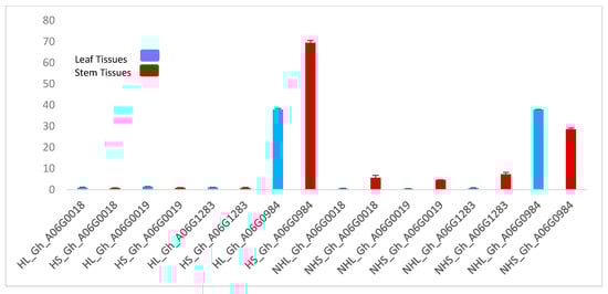 To further validate the role of these genes in trichome formation, we performed qPCR. The results of the qPCR are shown graphically in Figure 4. Stem tissue TUA5 (Gh_A06G0984) showed elevated expression levels; this gene also showed a marked expression level in the hairy leaf as well. Although this gene showed the same expression level in the non-hairy leaf, less expression was observed in non-hairy stem tissue.