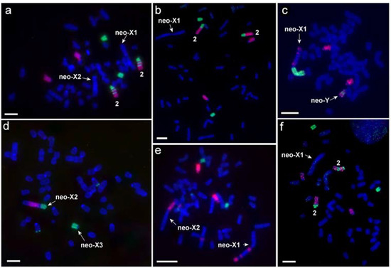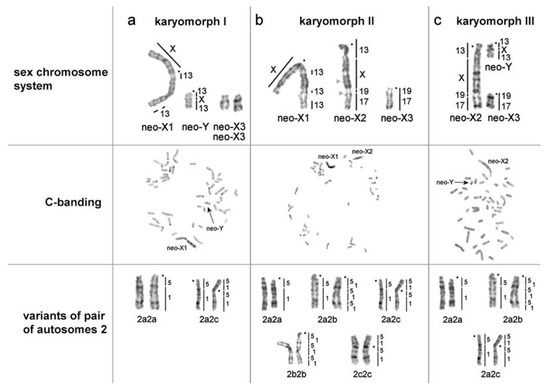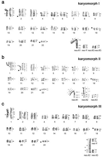 - Gladkikh, O.L.; Romanenko, S.A.; Lemskaya, N.A.; Serdyukova, N.A.; O’Brien, P.C.; Kovalskaya, J.M.; Smorkatcheva, A.V.; Golenishchev, F.N.; Perelman, P.L.; Trifonov, V.A. Rapid karyotype evolution in Lasiopodomys involved at least two autosome–sex chromosome translocations. PLoS ONE 2016, 11, e0167653. [Google Scholar] [CrossRef]