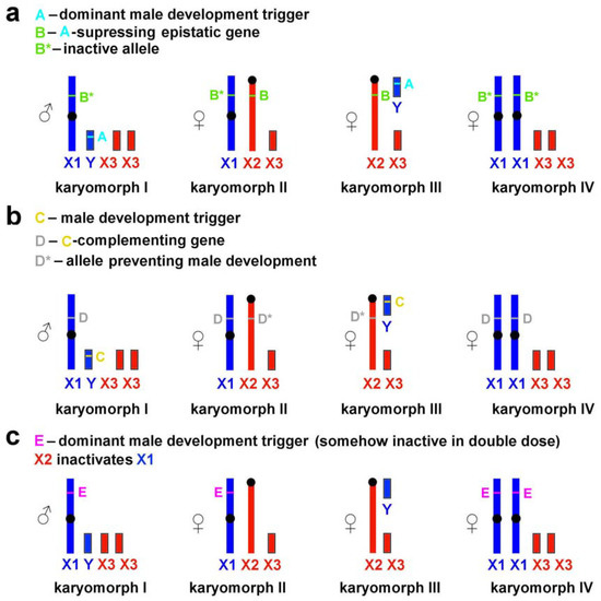- The neo-X1 chromosome contains a locus (D) complementing the male development trigger (C), whereas this locus is absent from or is inactive on the homologous neo-X2 (Figure 4b). In this case, the sex-determination system is similar to that described for Myopus schisticolor [41] where a deletion differentiates two types of X chromosomes [43]; the same has been suggested for Dicrostonyx torquatus [42]. Zhu et al. [8] proposed a possible role of deletions in the formation of sex chromosomes in L. m. faeceus.