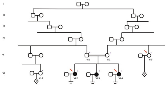 Consanguineous Turkish family with female infertility characterized by an oocyte maturation defect. Filled symbols indicate affected members and clear symbols indicate unaffected members. Blue asterisk (*) indicates collected samples, red arrows show samples for which WES has been performed.