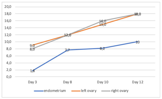 Follicular and endometrial growth (y axis in mm) during controlled ovarian stimulation of patient VI:4, where 11 immature oocytes had been collected with defective zona pellucidae. Leading follicle sizes were plotted for right and left ovaries. Blood estradiol level was 6580 pg/mL on day 12 and ovulation trigger was obtained using 0.2 mg triptorelin acetate.