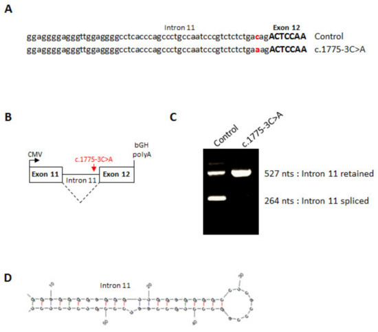 Splicing effect of the ZP1 mutation. (A) Sequence of human ZP1 from the end of intron 11 up to the start of exon 12 from a control minigene or a c.1775-3C>A minigene. (B) Line drawing of ZP1 minigene cloned into pcDNA3.1. (C) RT-PCR of wild type or mutant ZP1 mRNA expressed in CHO cells. (D) RNA hairpin structure formed by the end of ZP1 intron 11.