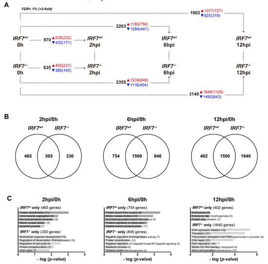 IRF7 deletion altered the host response against H6N2 infection (A) The number of differentially expressed genes (DEGs; FDR < 1%) for IRF7wt and IRF7-/- cell lines upon H6N2 infection at 2, 6 and 12 h post infections (hpi). Each horizontal comparison indicates the number of DEGs upon H6N2 infection at each time point compared to mock infection (0 h). The numbers of genes that have 2-fold expression changes are in the parentheses. (B) A Venn diagram of DEGs between IRF7wt and IRF7-/- cells upon H6N2 infection at each time point. (C) Gene ontology functional analysis was performed using each cell-specific DEG. The numbers of genes enriched in each biological process are in parentheses.