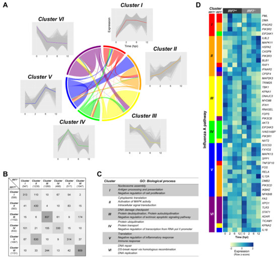 Gene expression profiles shifted as a result of IRF7 deletion in the host response. (A) The k-means clustering of differentially expressed genes (DEGs; n = 5091) and expression cluster shift of genes due to IRF7 knockout. Respective gene expression is shown in gray, and the representative expression pattern is highlighted in different colors. A chord diagram indicates the number of DEGs shifted clusters from IRF7wt to IRF7-/-. (B) The number of genes in each cluster. A complete list of genes in each cluster are in Table S4. (C) The biological process gene ontology terms of IRF7wt DEGs in each cluster. (D) DEGs in the influenza A pathway and their expression clusters between IRF7wt and IRF7-/- are shown on the left. The colors of the clusters correspond to the colors used in (A). A heatmap of gene expression of the pathway is in the right panel. See Figure S3 for each gene in the influenza A pathway.