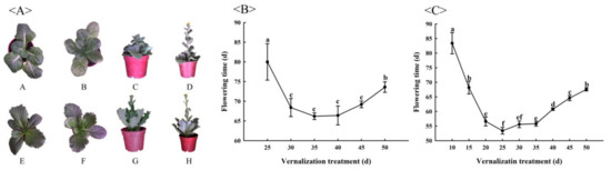 Brassica rapa is a leafy vegetable that belongs to the Brassicaceae family. It originated in China and has been widely distributed throughout the country, accounting for a wide area of vegetable cultivation. B. rapa is a high-yielding vegetable, is durable to storage and transportation, possesses a long supply period, is rich in nutrition, and diverse in consumption methods. This plant also occupies the primary position in vegetable production and daily consumption in China. It is generally planted in the fall from August to November. Spring planting was later developed to meet the demand for supply throughout the year. Spring sowing occurs under low temperature conditions and periods of long daylight, which cause B. rapa to prematurely bolt and flower, thereby causing the plant to lose some of its commercial value [18]. However, quickened bolting is a rapid breeding method that can help produce better accessions faster. Therefore, low-temperature vernalization has some positive effects on the cultivation of B. rapa, but further research is required to verify these effects.
