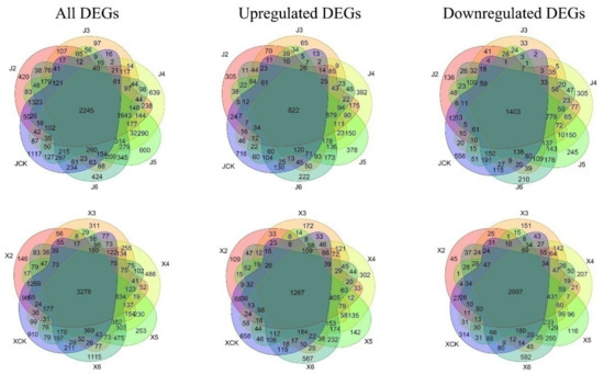 Venn diagrams of differentially expressed genes (DEGs) in the two B. rapa accessions during different vernalization periods. J2, J3, J4, J5, J6, and JCK represent the number of DEGs obtained by comparing ‘JinWawa’ 0 days after treatment (DAT) with 25, 30, 35, 40, and 50 DAT, and 35 DAT 25 °C, respectively. X2, X3, X4, X5, X6, and XCK represent the number of DEGs obtained by comparing ‘Xiao Baojian’ 0 DAT with 10, 15, 25, 40, and 50 DAT and 25 DAT 25 °C, respectively. False discovery rate (FDR) < 0.01 and |log2FC| > 1 were used as cut-off criteria for significance.