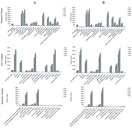 Gene ontology (GO) classification of the DEGs in ‘JWW’ (A) and ‘XBJ’ (B).