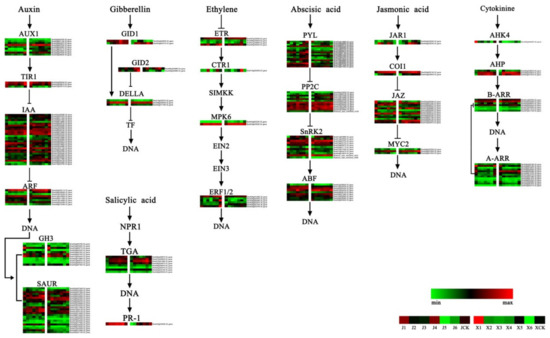 Heat map of plant hormone-related gene expression levels. Data were obtained using the log2fragments per kilobase of exon per million fragments mapped (FPKM) of each gene. Red and green represent up- and downregulated genes, respectively. AUX1 = auxin transporter-like protein; TIR1 = protein transport inhibitor response 1; IAA = auxin-responsive protein IAA; ARF = auxin response factor; GH3 = indole-3-acetic acid-amido synthetase GH3; SAUR = auxin-responsive protein SAUR; GID1 = gibberellin receptor GID1; GID2 = gibberellin receptor GID2; DELLA = DELLA protein RG; NPR1 = nonexpresser of PR genes 1; TGA = transcription factor TGA; PR-1 = pathogenesis-related protein 1; ETR = ethylene receptor; CTR1 = serine/threonine-protein kinase CTR1; SIMKK = SIMK kinase; MPK = mitogen-activated protein kinase; EIN2 = ethylene-insensitive protein 2; EIN3 = ethylene-insensitive protein 3; ERF = ethylene-responsive transcription factor; PYL = abscisic acid receptor PYL; PP2C = protein phosphatase 2C; SnRK2 = serine/threonine-protein kinase SRK2; ABF = abscisic acid-insensitive; JAR1 = jasmonic acid-amido synthetase JAR1; COI1 = coronatine-insensitive protein 1; JAZ = protein TIFY; MYC2 = transcription factor MYC; AHK4 = histidine kinase 4; AHP = histidine-containing phosphotransfer protein; A/B-ARR = two-component response regulator ARR.
