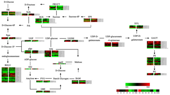 Heat map of the starch and sucrose-related gene expression levels. Data were obtained using the log2FPKM of each gene. Red and green represent up- and downregulated genes, respectively. HK = histidine kinase; BGLU = beta-glucosidase; pgm = phosphoglucomutase; Scrk = fructokinase; SUS = sucrose synthase; UGP = UTP-glucose-1-phosphate uridylyltransferase; UDP = uridine diphosphate–glucose; UGDH = UDP-glucose 6-dehydrogenase; malZ = alpha-glucosidase; glgc = glucose-1-phosphate adenylyltransferase large subunit; SS2 = starch synthases 2; PYG = alpha-glucan phosphorylase; GBE = glucan-branching enzyme; Frk = fyn related Src family tyrosine kinase; BAM = maltose beta-amylase; XYL = beta-D-xylosidase; GAUT = beta-D-xylosidase; PE = pectinesterase/pectinesterase inhibitor; PG = phosphoglucomutase; TPS = trehalose-phosphate synthase; FRUCT = beta-fructofuranosidase; SPS = sucrose-phosphate synthase.