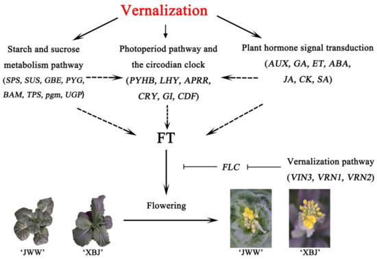 In Arabidopsis, TPS plays a critical role in controlling the transition from vegetative to reproductive growth [75,76]. TPS catalyzes the formation of trehalose-6-phosphate (T6P) from glucose-6-phosphate and uridine diphosphate–glucose (UDP-glu) and is a signaling molecule that relays information regarding carbohydrate availability to other signaling pathways [77,78]. The loss of TPS resulted in extremely delayed flowering in Arabidopsis. The TPS pathway also acts as a signal that coordinates the induction of flowering by regulating the expression of key floral integrators in the leaves and SAM [79]. In this study, the TPSs of ‘XBJ’ expressed during vernalization were less than ‘JWW’. It may be that the late-bolting ‘JWW’ accession requires higher TPS expression in order to promote faster flowering. The upregulation of pgms promotes the production of polysaccharides, which has been demonstrated in mushrooms [80]. In this study, pgms increased at first and then decreased during vernalization. Therefore, it is speculated that pgms rose rapidly at the beginning of vernalization in order to provide sufficient energy for normal growth, and then it gradually decreased after the vernalization transformation period. In young and mature leaves, UGP is primarily involved in the sucrose biosynthesis pathway, the major form of transport of carbon in plants, which provides energy to plants [81]. In this study, two UGP genes exhibited opposing states during vernalization, in which, one was upregulated and the other was downregulated. The underlying mechanisms for these contrasting trends, however, require further investigation.