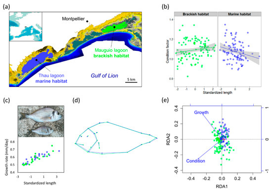 Phenotypic variation of juvenile sea bream from different nursery habitats. (a) Juveniles of the same year cohort were sampled in two closely located nursery habitats in the Gulf of Lion: A stable but low-productivity marine habitat (Thau lagoon, blue) and a stressful but highly productive brackish habitat (Mauguio lagoon, green). (b) Habitat-dependent correlation between individual standardized length and condition factor (ANCOVA interaction term: P = 0.003, shaded areas indicate 95% confidence intervals). (c) Predictive accuracy of standardized length for somatic growth rate estimated through otolith age reading in 20 individuals from each habitat (