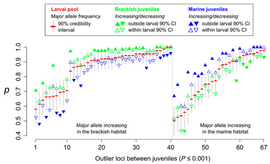 Allele frequency changes at 67 outlier loci detected between brackish and marine juveniles with the single generation selection (SGS) test, using a nominal significance threshold of 10−3. For each locus, allele frequency of the major allele (p) is indicated in the larval pool (red, with the 90% credibility interval in grey), brackish juveniles (green triangles) and marine juveniles (blue triangles). Upper triangles show increased allele frequency compared to the larval pool; lower triangles show decreased allele frequency compared to the larval pool.