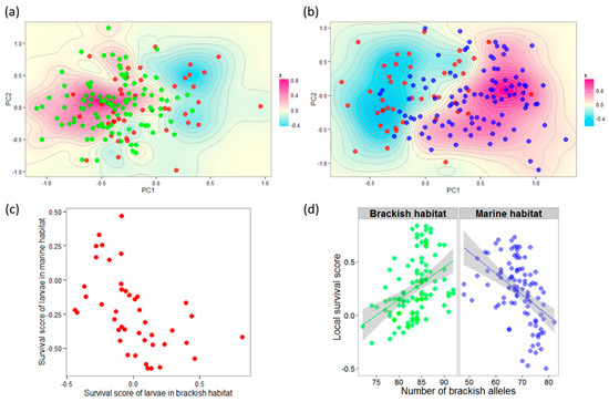 Genotype–fitness relationships assessed with 67 outlier loci detected with the SGS test. Individual coordinates in the two first PCA axes were compared (a) between larvae (red) and brackish juveniles (green) or (b) between larvae and marine juveniles (blue) to estimate the relative enrichment or depletion of multilocus genotypes over the genotypic space (z, the relative survival probability score surface) in each habitat. (c) Estimated survival scores of larvae show a moderate trade-off between habitats. (d) The sum of brackish-favored alleles in individual juveniles is positively correlated with survival score in the brackish habitat but negatively correlated in the marine habitat (ANCOVA interaction term: P = 6.6 × 10−11).