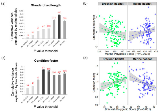 The proportion of phenotypic variance cumulatively explained by nominally significant variants detected by the SGS test first increased with decreasing nominal significance thresholds and then decreased (Figure 4a,c). The amount of explained variance for standardized length was maximized for a nominal significance threshold of P = 0.0075, at which 495 loci cumulatively explained 3.85% of phenotypic variation in interaction with habitat using the marine polygenic score (Figure 4b; ANCOVA: P = 0.046; interaction term: P = 6.5 × 10−3). A similar trend was obtained using measures of mean summer otolith growth rate from 40 juveniles and a nominal significance threshold of P = 0.01 to detect candidate selected SNPs. However, the significance of the interaction between the marine polygenic score and habitat was only suggestive (interaction term: P = 0.077) due to a lack of power.