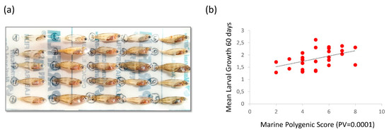 Phenotypic variance explained by outlier loci in the independent sample of larvae. (a) Picture of larvae collected on the same day, showing differences in size between individuals. (b) Positive correlation (