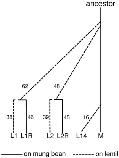 Reversion lines, in which lentil-adapted lines were reverted back to mung bean, were established once the lentil-adapted populations had reached a plateau in fitness on lentil (as measured by survival during performance assays [,]). Lentil lines were reverted to mung bean at F62 for L1, and at F48 for L2 (Figure 1, Table S1). The difference in time of reversion was simply due to L1 having been established earlier than L2. Each reversion line was generated by transferring >2000 adults to 750 g of mung beans, and the same protocol was used for each successive generation. In this manner, successive generations of both lentil (non-reverted) and reverted lines were formed in the same fashion.