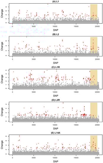 We do not attempt to estimate selection coefficients from these data (this was the focus of past work, e.g., [,]), but rather to identify contiguous sets of SNPs exhibiting exceptionally high amounts (or rates) of evolutionary change (see for example []), which we then compare with genetic regions associated with performance traits or differential gene expression between hosts and lines (see below). Note, however, that past tests of selection based on parameterized models of genetic drift showed that natural selection contributed to evolutionary change in the lentil and reversions lines, especially at loci exhibiting the greatest allele frequency changes [,]. To this end, we first estimated standardized allele frequency change for each locus and pair of samples as , where and denote the Bayesian estimates of the allele frequencies in the derived (second) and ancestral (first) sample for each pair of lines and samples given above (the superscripts here are indexes not exponents). The denominator is proportional to the ancestral population expected heterozygosity and the expected variance in allele frequency, and thus to the expected change by drift or selection (conditional on and the strength of selection). Thus, this standardizes observed change by the genetic variation at a locus and aids in comparisons across loci. However, because the lines and samples differ in and in the time elapsed [,], values are not directly comparable across the different line and sample pairs.