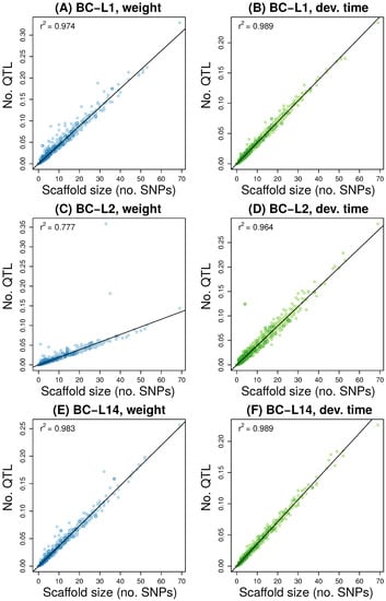 The scatter plots depict Bayesian estimates for the number of QTL (i.e., causal variants) on each scaffold as a function of scaffold size (here measured as the number of SNPs). Results are shown for each back-cross line (BC-L1, BC-L2 and BC-L14) and trait (weight [A, C, and E] and development time [B, D, and F]). Points representing X-linked scaffolds are denoted with dark outlines. A best fit line from linear regression is given and the coefficient of determination () is reported. Points that fall well-above the best fit line harbor more QTL than expected given their size and a highly polygenic architecture of very small effect variants scattered evenly across the genome.