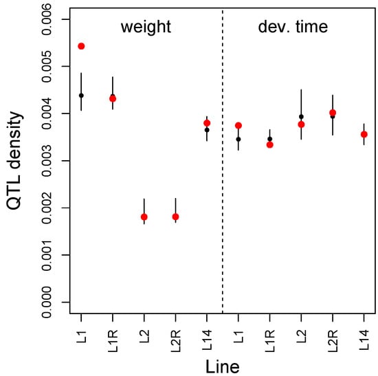 Performance-trait QTL density (number of QTL per SNP) for SNPs exhibiting exceptional allele frequency change in the E&R experiments. Results are shown for adult weight and development time for each pair of lines or samples (see main text for details). Red dots denote the observed density. Black dots (median) and vertical lines (2.5th to 97.5th percentile) denote the null expectations from randomization tests.