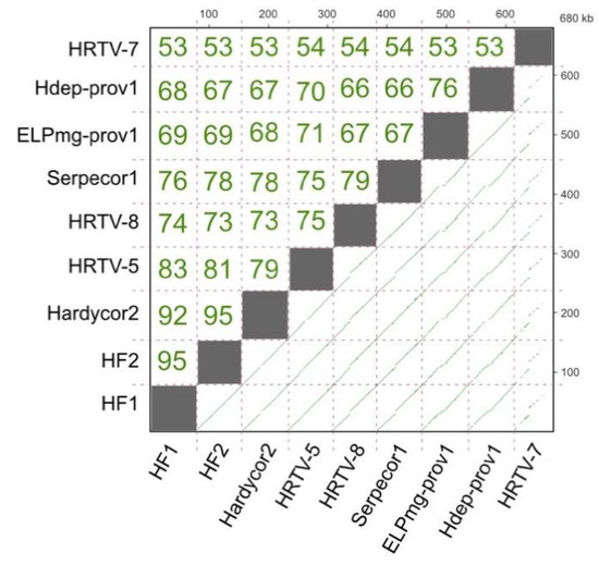 Genome length varies between 74.2–77.6 kb, except for HRTV-7 which is significantly shorter at 69.0 kb. A dot plot of the nucleotide similarity of all HF1-group viruses is presented in Figure 2, along with their pairwise similarity values calculated after multiple alignment. All but HRTV-7 have similarity values between 66% and 95%. Hardycor2 shows the highest similarity to HF1 and HF2 (92–95%), while Serpecor1 is most similar to HRTV-8 (79%). The outlier is HRTV-7, which shows 53–54% nucleotide similarity to all other members of the HF1-group, and only patchy lines of similarity in dot plot comparisons.