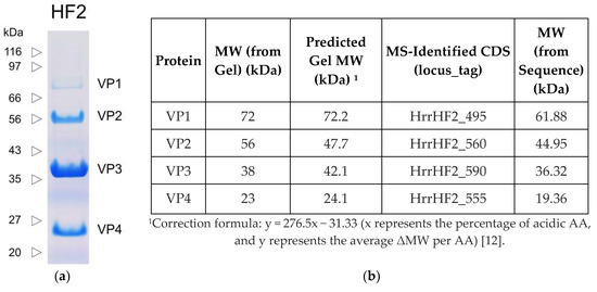 (a) SDS-PAGE of HF2 proteins (Coomassie Blue stained). (b) Molecular weights and identified genes of VP1-VP4.