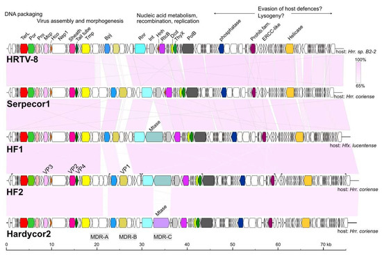 The genome maps of Serpecor1 and Hardycor2 are shown in Figure 4, along with maps of their closest relatives, HF1, HF2 and HRTV-8. All have TDR (Table 2) and corresponding genes are colored the same on different genomes. The light pink shading between maps indicates high nucleotide similarity, which is also reflected by the strongly conserved gene synteny among these viruses. Three major variable regions, MDR-A, -B and -C (interrupted shading), are found within a roughly 16 kb region between the genes encoding tape measure protein (Tmp) and the site-specific integrase (Int), or from about 20 to 36 kb in Figure 4. Variation in this region was first reported between HF1 and HF2 (see Figure 1 of [3]); two viruses that share high sequence similarity but have distinctly different host ranges. Another notable difference seen in Hardycor2 is the gene (HrrHc2_200) for a methyltransferase (Mtase). Five viruses (HF1, HF2, HRTV-5, ELPmg-prov1 and Hdep-prov1) carry an N-6 DNA methyltransferase in the same gene neighborhood, and the encoded proteins share high sequence similarity (78–96% aa identity, Figure S1), however, the Hardycor2 methyltransferase is only distantly related to these (16% aa identity) and the gene is oppositely oriented (Figure 4), indicating a distinct evolutionary history. Serpecor1 and HRTV-8 lack a methyltransferase gene at this position, highlighting the flexibility for gene insertion and loss in this region, perhaps influenced by the nearby integrase and attP. Two types of long, AT-rich, intergenic repeat (IR) sequences, designated class I and class II, were described in HF1 and HF2 [3,4] and speculated to control the transcription of the genome. These IRs are strongly conserved among HF1-group viruses, and a comparison between the IR sequences of HF2 and those of Hardcor2 and Serpecor1 is given in Supplementary Figure S3. The promoter activities of these motifs in the HF2 genome have been confirmed [30] (Russ et al., manuscript in preparation).