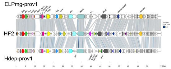 Comparison of HF2 and the provirus elements Hdep-prov1 of Hrr. depositum Y78 (located between FGM06_RS03355 to FGM06_RS03870) and ELPmg-prov1 (from scaffold ID JGI12451J12833_1000001; NCBI project accession PRJNA366386). Scale is shown underneath, in kb. The tBLASTx similarity between the genomes is indicated by the grey-to-blue shading (key upper right). A number of gene products are indicated above the ELPmg-prov1 map (see Figure 4 for details). Additional genes are indicated below the Hdep-prov1 map as follows; TBP, transcription factor B protein; HalDo1, Halobacterial output domain 1 containing protein; DUF262, domain of unknown function (DUF) 262 containing protein; MarR-fam., MarR family transcription factor; Hnh, HNH endonuclease.