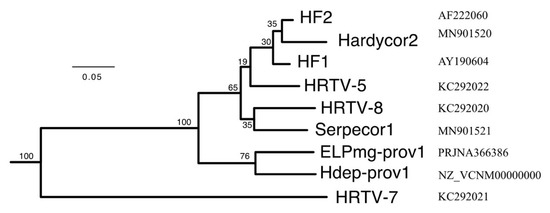 The protein sequences encoded by all HF1-group viruses were used to infer phylogenetic trees using the VICTOR webservice (https://victor.dsmz.de). This implements the Genome-BLAST Distance Phylogeny method (GBDP) as described in [17], and is designed to assist delineating virus taxa, particularly at the genus and species levels. A representative tree is shown in Figure 7, and shows that six of the seven viruses form a tightly clustered and strongly supported clade. HRTV-7 branches before this clade but is still specifically related to them. This analysis also included taxonomic predictions (Supplementary Table S4), which indicates they all belong to the same viral genus, and all represent different species within that genus, except for HF1 and HF2, which were placed in the same species.