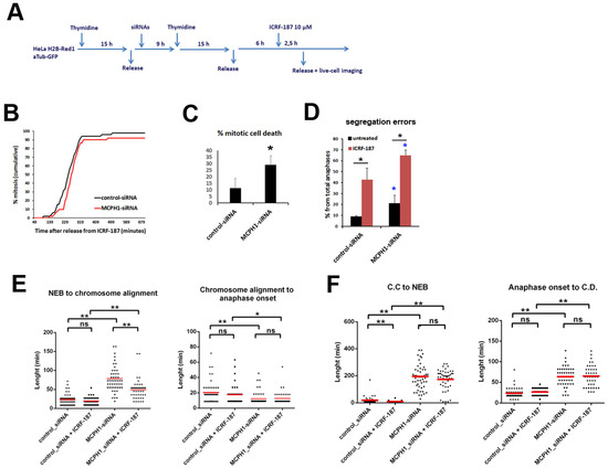 We have used a modified HeLa cell line—H2B/Red1 and alpha-tubulin/GFP tagged which was originally established at Duncan J Clarke’s laboratory [29]. Cell culture was done following standard conditions, in a humidified atmosphere under 5% CO2 at 37 °C while using DMEM medium that was supplemented with 10% of fetal bovine serum (FBS) and antibiotics (1% Penicillin-Streptomycin). The cells were split every two or three days. For RNA interference (RNAi) treatments, cells were transfected with 120 nM small interfering RNA (siRNA) duplexes using Lipofectamine (Invitrogen; ThermoFisher Scientific, Waltham, MA, USA) at 75% confluence and they were imaged live or processed approximately 24 h after transfection. OptiMEM medium (Invitrogen) was used for cell transfection. The MCPH1_siRNA duplexes used are based on previous studies and knocked-down the MCPH1 protein levels efficiently [13,29,32]. MCPH1 siRNAs were purchased from Qiagen (Germantown, MD, USA). As a negative control in our experiments, we used scrambled siRNA duplexes (ThermoFisher Scientific). The synchronization of cells at G1/S was achieved by a double-thymidine blocking protocol (final concentration of 2 mM thymidine in medium), as detailed in [13,29]. The inhibitors employed were ICRF-193 and ICRF-187 (final concentration depending on the experiment), CHIR124 (final concentration 150 nM) and etoposide (15 µM) are from Sigma-Aldrich (St. Louis, MO, USA). The untreated control cells were incubated in all cases with a similar volume of inhibitor solvent (dimethyl sulfoxide).