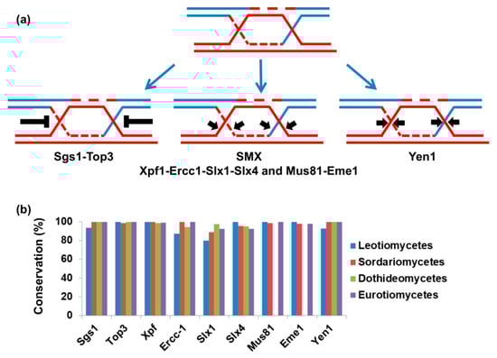 Mechanisms of Holliday junction resolution (a). Four evolutionarily conserved mechanisms to resolve Holliday junctions or similar joint molecules. Holliday junction dissolution: RecQ helicase (Sgs1) facilitates the migration of two Holliday junctions toward each other to yield a hemicatenane structure that is relieved by topoisomerase III. The second and third mechanisms of Holliday junction resolution are based on the activity of the SMX complex: a complex of three nucleases participates in introducing nicks into the Holliday junction, thus resolving them. The complex is composed of Xpf-Ercc1, Slx4-Slx1, and Mus81-Eme1 but Mus81-Eme1 also acts independently. The fourth mechanism of Holliday junction resolution is based on the activity of Yen1 that introduces asymmetric incisions across the joint junctions; (b) using comparative genomics; we identified the repertoire of Holliday junction resolution genes in species from Pezizomycotina (classes Leotiomycetes, Sordariomycetes, Dothideomycetes and Eurotiomycetes). Conservation represents the fraction of species that encode the genes shown on the X-axis in each class.