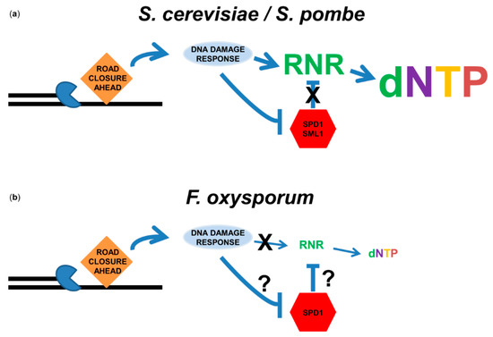 - Cohen, R.; Milo, S.; Sharma, S.; Savidor, A.; Covo, S. Ribonucleotide reductase from Fusarium oxysporum does not respond to DNA replication stress. DNA Repair (Amst.) 2019, 83, 102674. [Google Scholar] [CrossRef]