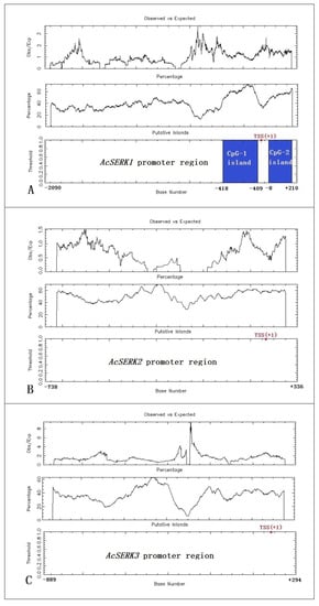 Bioinformatics prediction of CpG islands in the promoter regions of three AcSERKs. (A) AcSERK1 promoter region contains two CpG islands, which are indicated in blue. (B,C) The bioinformatics prediction results of CpG islands in the AcSERK2 and AcSERK3 promoters, respectively. Neither is predicted to contain CpG islands. The Cpgplot program defines a CpG island as a region corresponding to the following parameters: Observed/Expected ratio >0.60, Percentage C + Percentage G >50.00, and Length >200. The transcription start site is represented by TSS (red dot), and this site is defined as +1.