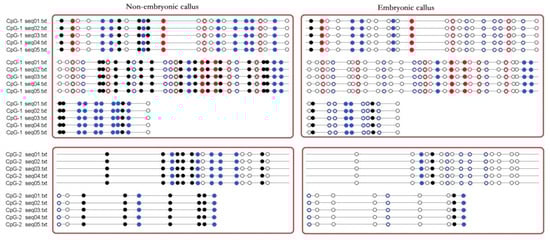 In the CpG-2 island, which was downstream of the TSS in the AcSERK1 promoter, there were a total of 16 CG and 8 CHH sites. Of these, only 2 CG and 2 CHH sites were methylated in embryonic callus. In contrast, in non-embryonic callus, 11 CG and 7 CHH were methylated (Figure 2). Thus, the methylation status of the two CpG islands in the AcSERK1 promoter during in vitro culture is differentially regulated between embryonic and non-embryonic callus.