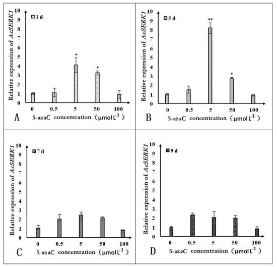 Effect of different concentrations of 5-azaC treatment for different times (3, 5, 7, or 9 days) on the expression levels of AcSERK1. (A–D) The effects of different concentrations on the expression of AcSERK1 during 5-azaC pretreatment at 3, 5, 7, and 9 d, respectively. The data were the average of 3 biological replicates, and the error bars denote the standard error of the mean. The expression differences with different treatments were compared using a one-way ANOVA by SPSS 19.0. * p < 0.01 and ** p < 0.05.