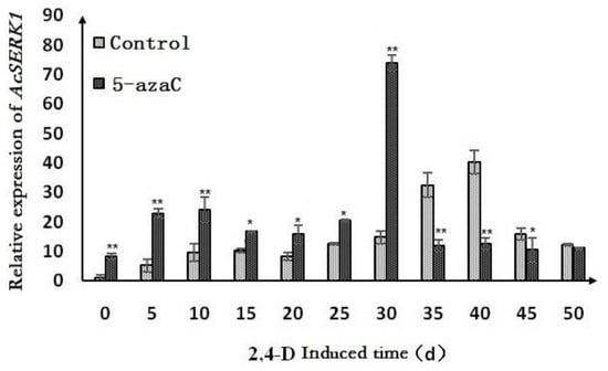 Effect of 5-azaC on the expression of AcSERK1 during the process of SE. The data were the average of 3 biological replicates and the error bars denote standard error of the mean. Comparisons between pretreated (5-azaC) or untreated (“Control”—without 5-azaC) at the same induction times. The expression differences with different treatments were compared using a one-way ANOVA by SPSS 19.0. * p < 0.01 and ** p < 0.05.