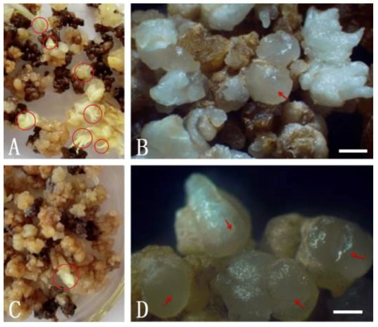Effect of methylation inhibitor 5-azaC treatment on somatic embryo induction. (A,B) Display embryos without 5-azaC pretreatment, and (C,D) display embryos with 5-azaC pretreatment, and all panels are representative images of embryos 30 days after somatic embryo induction. Arrows indicate globular embryos. Circles indicate adventitious shoots. Scale bar = 400 μm.