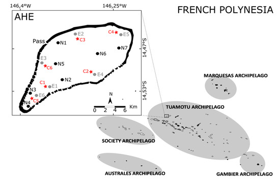 Sampling sites of the study in Ahe Atoll, Tuamotu Archipelago, French Polynesia, showing the location of the six exploited sites (E, in grey), seven natural sites (N, in black) and six collector sites for spats (C, in red).