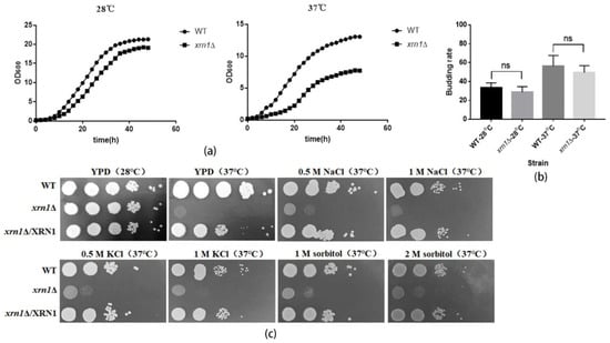 To investigate whether the increase in cell size would impair yeast growth, we further measured the growth curves of the wild type and xrn1∆ strains. The growth of the xrn1∆ mutant was slightly decreased at 28 °C compared to the WT. However, it was significantly decreased at 37 °C (Figure 3a). The slow-growth phenomenon was not caused by a decrease in the budding rate of the xrn1∆ mutant, because we found that the budding rate of the xrn1∆ mutant was not significantly different from that of the wild type (Figure 3b). We also analyzed the growth of the xrn1∆ mutant on YPD medium at 37 °C and found that the growth was defective in the xrn1∆ strain at 37 °C, which is consistent with previous research [22]. The addition of osmotic stabilizers such as NaCl, KCl and sorbitol did not fully restore the growth defect (Figure 3c). In addition, there was no significant difference in the growth of medium containing KCl, NaCl and sorbitol at 28 °C between the xrn1∆ and wild-type (Figure S3).